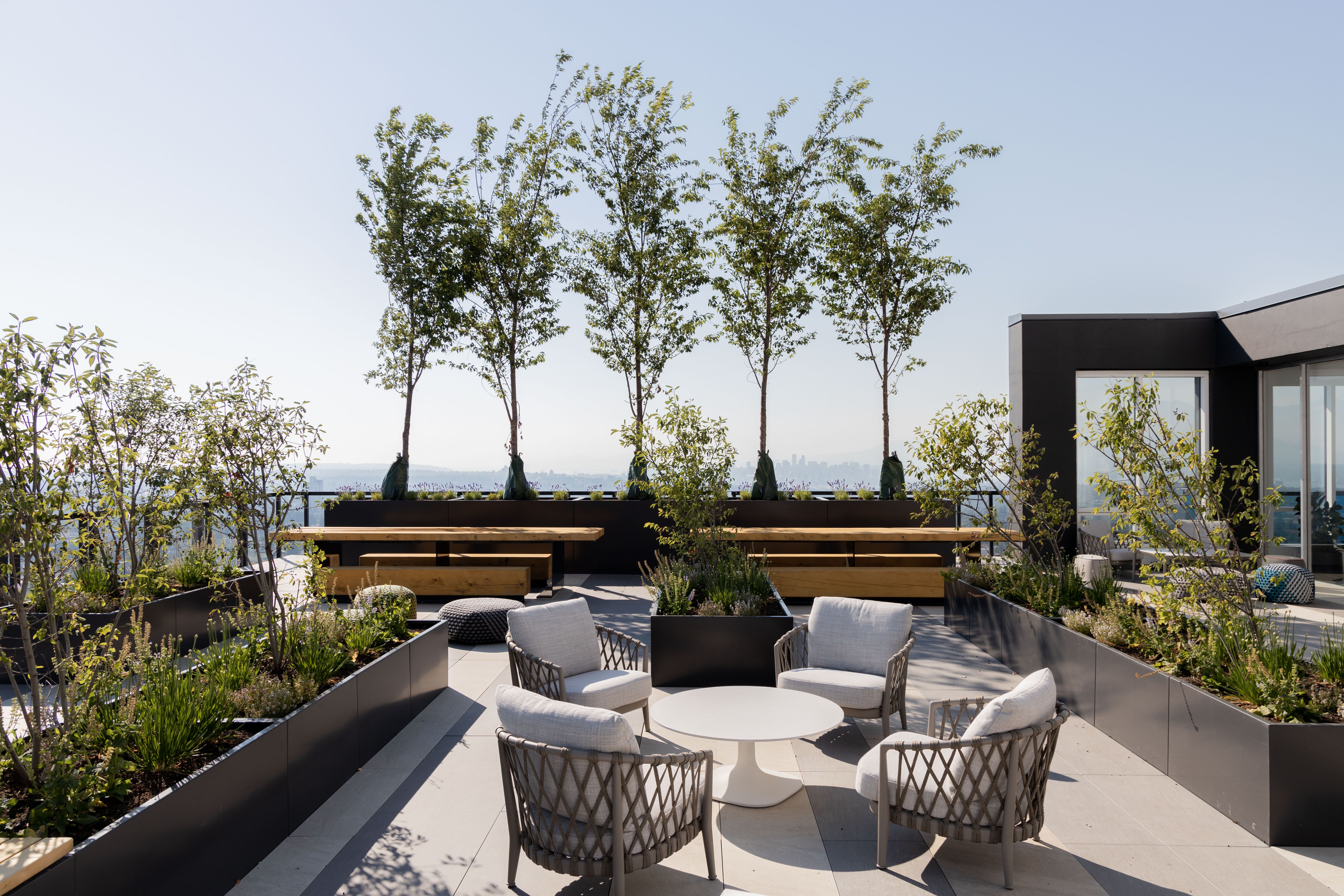 The JOYCE Rooftop Learning & Activity Lounge is surrounded by a large balcony terrace and patio with ample urban gardens, resort-style lounge seating, a fire-pit, barbeque grill for outdoor dining entertainment, and play areas for our young residents. With panoramic views of English Bay, the Vancouver skyline and Burrard Inlet, there is little doubt the Rooftop Learning & Activity Lounge will bring residents together.
