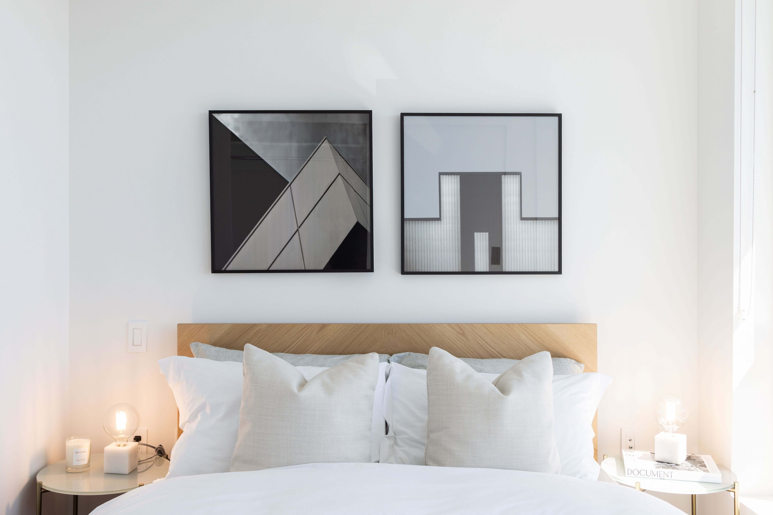The experience begins with the oversized solid wood suite entry door that provides the security and portal into your home. The neutral tones of the large porcelain floor tile and the white oak kitchen envelope the home in warmth, drawing in the natural light from the expansive windows. The white detailing of the kitchen shelving and countertops provide a crisp counterpoint to the warm palette. The bathroom has been designed to create personal spa experiences. The dusky colour of the walls and floor combined with the custom matte black finish on the fixtures create a relaxed and sensuous mood. The white detailing of the vanities and surfaces provide another layer of continuity across the spaces within the home.